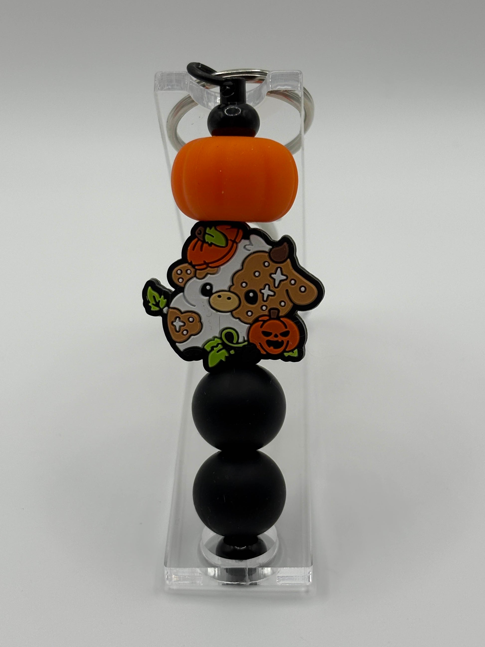 This adorable Highland cow keychain is all dressed up for fall, surrounded by cheerful jack-o’-lanterns and cozy harvest colors. Handmade using high-quality materials, it’s the perfect seasonal accessory to add a touch of farmhouse charm and Halloween fun to your keys, bag, or backpack.